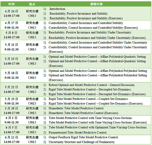 为对标国际顶尖高校,加快“双一流”建设步伐,365英国上市公司特邀控制科学与工程领域知名专家Saša V. Raković教授于4月24日至6月12日期间在英国上市官网365开设前沿控制理论公开课。该课程为我校第二期来华留学英文授课品牌课程《随机过程理论及应用》的选修模块,课程内容涵盖模型预测控制,鲁棒模型预测控制等前沿控制理论。课程主要面向研究生和高年级本科生,欢迎感兴趣的同学参加。具体开课时间、地点和课程内容安排如下: