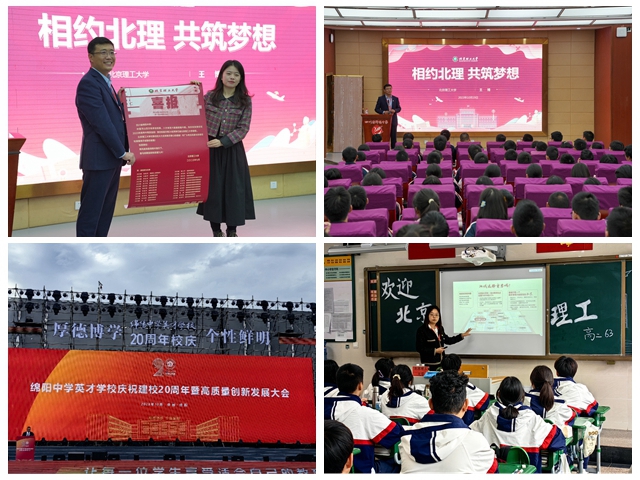 王博副院长、李怡然老师先后到绵阳中学、绵中英才学校进行宣传宣讲。10月19日,王博副院长向绵阳中学赠送了2023年高考招生录取喜报,并做题为《相约北理 共筑梦想》的报告;20日,两位老师赴绵阳中学英才学校参加建校20周年庆典,王博副院长向绵阳中学英才学校授牌“优秀生源建设基地”,李怡然老师走进班级做《相约北理 共筑梦想》报告,与近百位目标生源就招生政策、专业特色等问题做广泛交流。