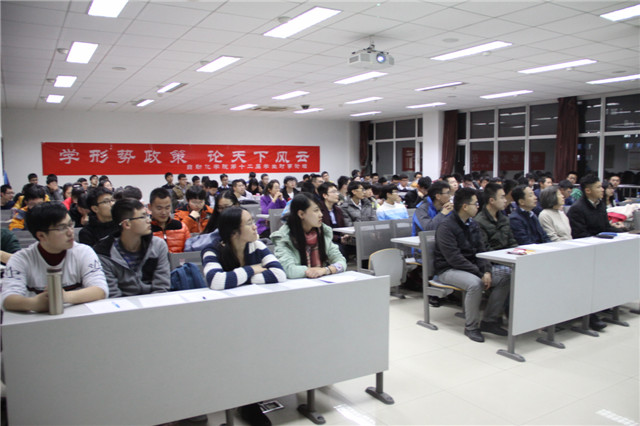 金军书记在论坛开始前作了讲话,他认为时事论坛为关心国内外时事的同学提供了一个良好的交流平台,具有重要现实意义。他要求学生党员严格要求自己,在集体中起到模范带头作用,争做践行社会主义核心价值观的排头兵。他希望学生党员带领身边同学在学习生活中树立正确的价值观,弘扬主旋律,激荡正能量。最后,金书记以 “风声雨声读书声声声入耳,家事国事天下事事事关心”勉励各位同学并宣布论坛正式开始。