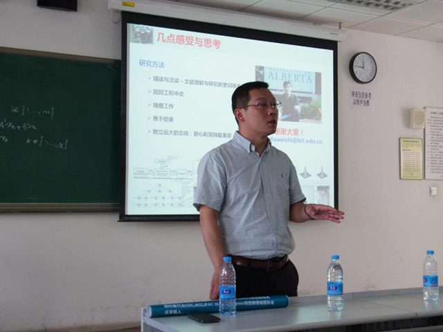 关于博士生涯,史老师从大三学年结束获得本直博资格时开始讲起,到跟着导师王军政教授做科研,再到公派至加拿大阿尔伯塔大学攻读博士研究生,仔细分享了自己求学和科研之路上的“酸甜苦辣”。诙谐、生动的讲述吸引了全场的目光,在场的师生不时发出掌声。他指出良好的科研习惯十分重要,科研工作要做得精细,并建议同学们及早规划人生,树立远大的志向。
