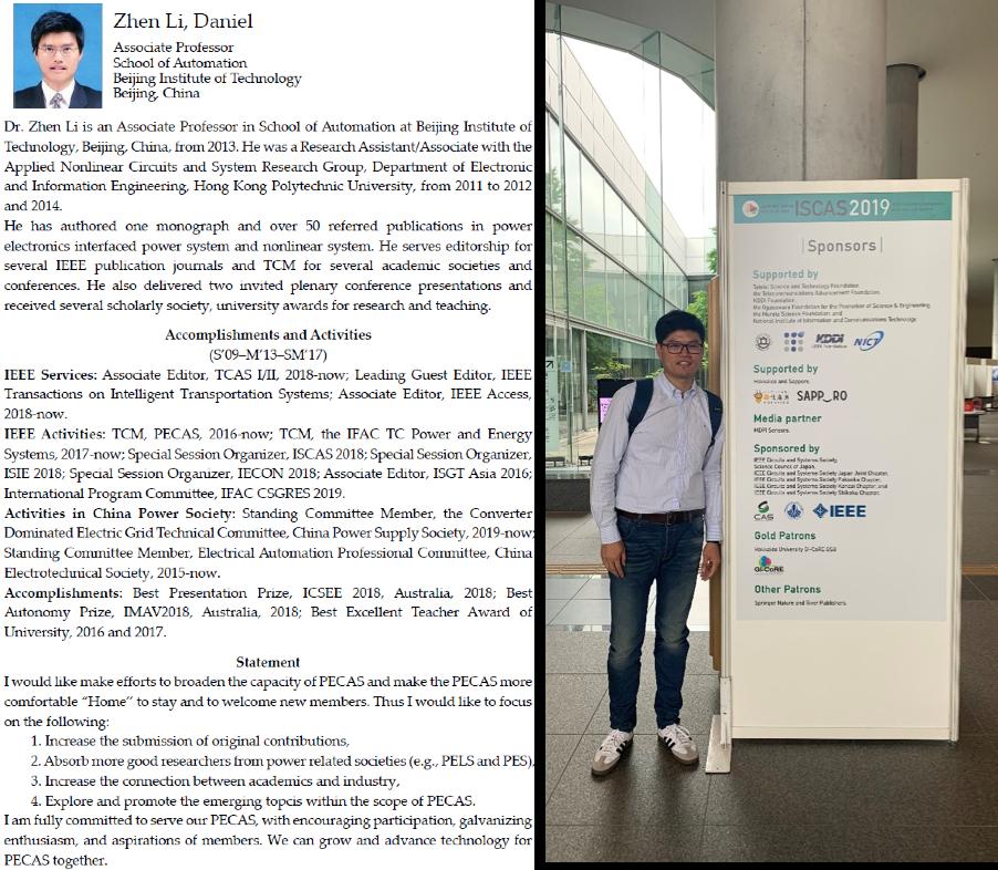 2019年5月25日至29日,365英国上市公司青年教师李震副教授出席于日本札幌举行的IEEE电路与系统学会旗舰会议ISCAS2019(IEEE International Symposium on Circuits and Systems)。与会期间,通过IEEE电路与系统学会执行主席提名,学会旗下两大期刊编委会(IEEE Transactions on Circuits and Systems I/II)与能源专委会统一投票,李震副教授成功当选IEEE电路与系统学会能源专委会(PECAS)候任主席(Chair Elect,2021年至2022年),并将于2022年至2023年直接升任总主席,上任后将成为IEEE PECAS三十年历史上第一位来自中国大陆地区的总主席。在2020至2023的四年中,李震副教授将负责IEEE电路与系统学会能源专委会全球事务的管理与推广,并统筹专委会、学会期刊能源领域的发展方向。