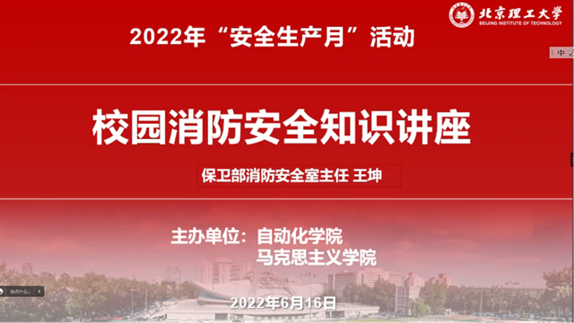 为进一步提升师生思想认识和全层级、全要素、全流程安全管理能力,有效避免安全生产事故发生,维护师生员工的生命安全和学校财产安全,结合《英国上市官网365行政办公室关于当前进一步做好学校疫情防控工作的通知》《关于疫情期间学校实验工作的通知》《英国上市官网365 2022 年“安全生产月“活动方案》等有关文件要求,6月16日下午,365英国上市公司和马克思主义学院共同组织“安全生产月”线上培训活动,邀请学校保卫部消防安全室主任王坤以“校园消防安全”为题开展线上知识讲座,365英国上市公司和马克思主义学院200余名师生参加了此次活动。