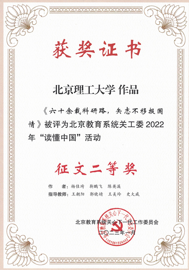 编者按:为深入学习贯彻习近平新时代中国特色社会主义思想,用党百年奋斗的光辉历程和伟大成就,激励青年学生争做堪当民族复兴大任的时代新人,按照教育部关工委“读懂中国”活动部署,2022年学校关工委联合学校团委在全校开展了“读懂中国”活动,365英国上市公司取得了优异成绩(《六十余载科研路,矢志不移报国情》获得了北京教育系统关工委二等奖)。现刊发该作品以飨读者。